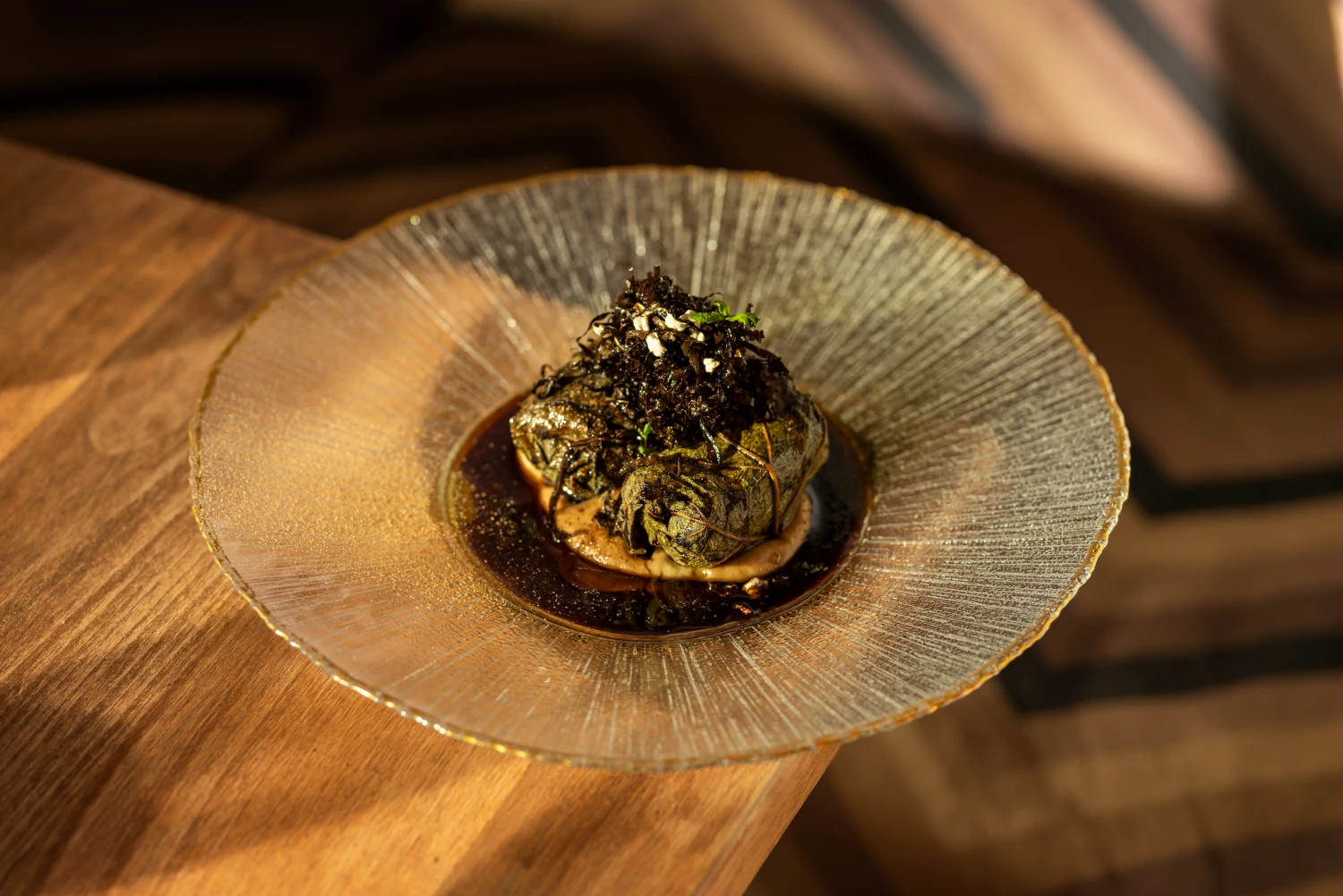 A sufnudli (Schupfnudel) a Mag menü egy pontján is előjön, de még nem tartunk ott. A gazdag leves után egy újabb meleg előétel, a szárma, erdei gombák, zöldség jus következett, mellé 2023-as kékfrankos a Csillagvölgy-dűlőből. Magamnak úgy fordítom: a magyar töltött káposzta, a görög dolmadesz (töltött szőlőlevél) és a tölteléket illetően az olasz gombás rizottó édeshármasa. Ami a mediterrán beütéseket illeti, ezt utóbb Richárd is említi, az étlap több elemében például toszkán fogások jelennek meg sváb perspektívából.