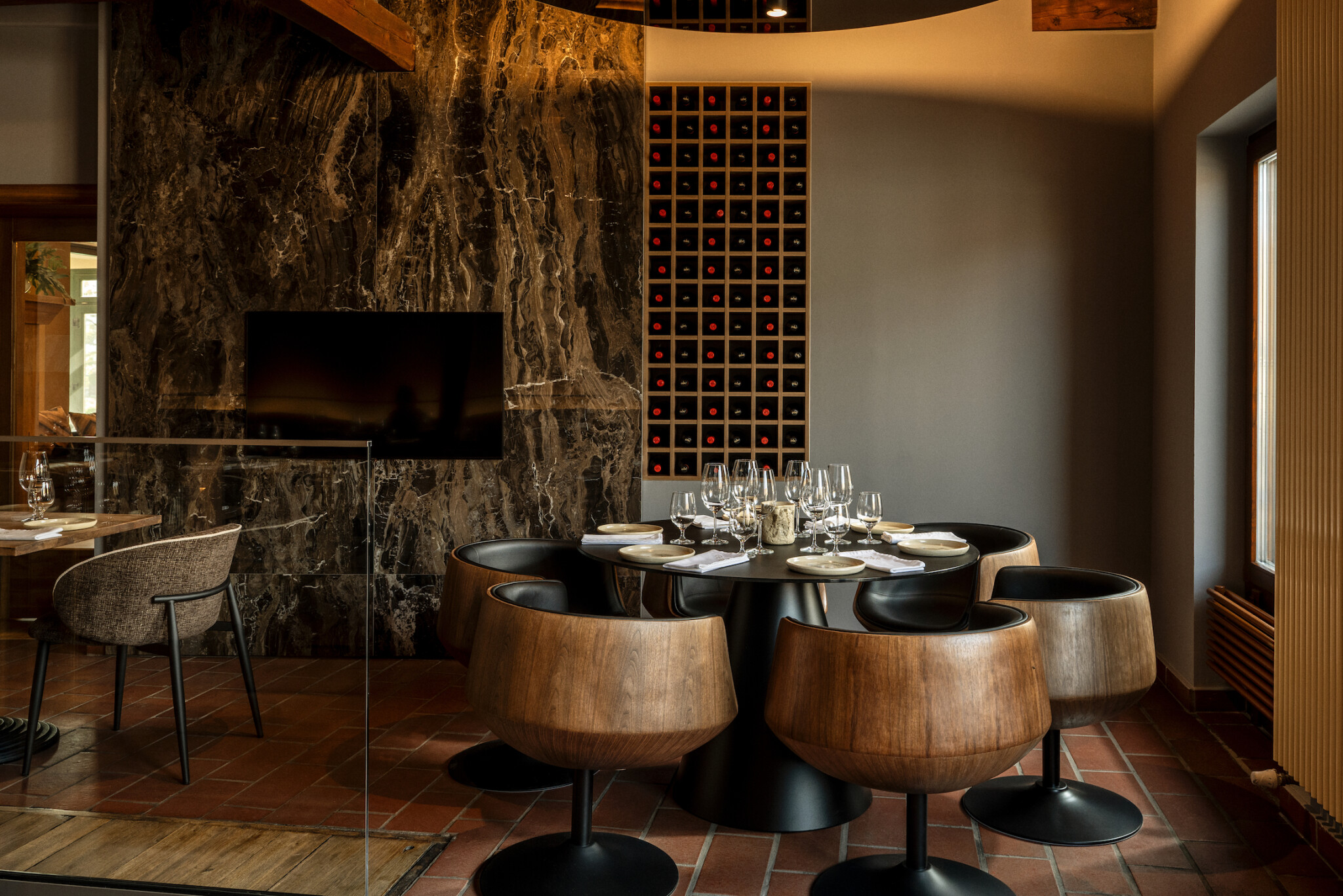 A vendégtér központi része most a nagy kandalló előtti bár rész, barnás színekkel, kerek és kagylóformájú buklészövetű dizájnszékekkel, meleg fényekkel, az egyik sarokban süppedős bőrkanapéval – mintha egy nagy nappaliba vagy könyvtárszobába lépnénk. Az új étterem eggyel beljebb abban a térben kapott helyet, ahol sok-sok évvel ezelőtt az első vendégeket is fogadták, ez úgy nagyon mai (a falon például elektromos látványkandallóval), hogy közben itt is mindenhol régi gerendák és a boroshordók dongáiból készült parketta adják meg a borkészítés és a hagyományok tiszteletét.