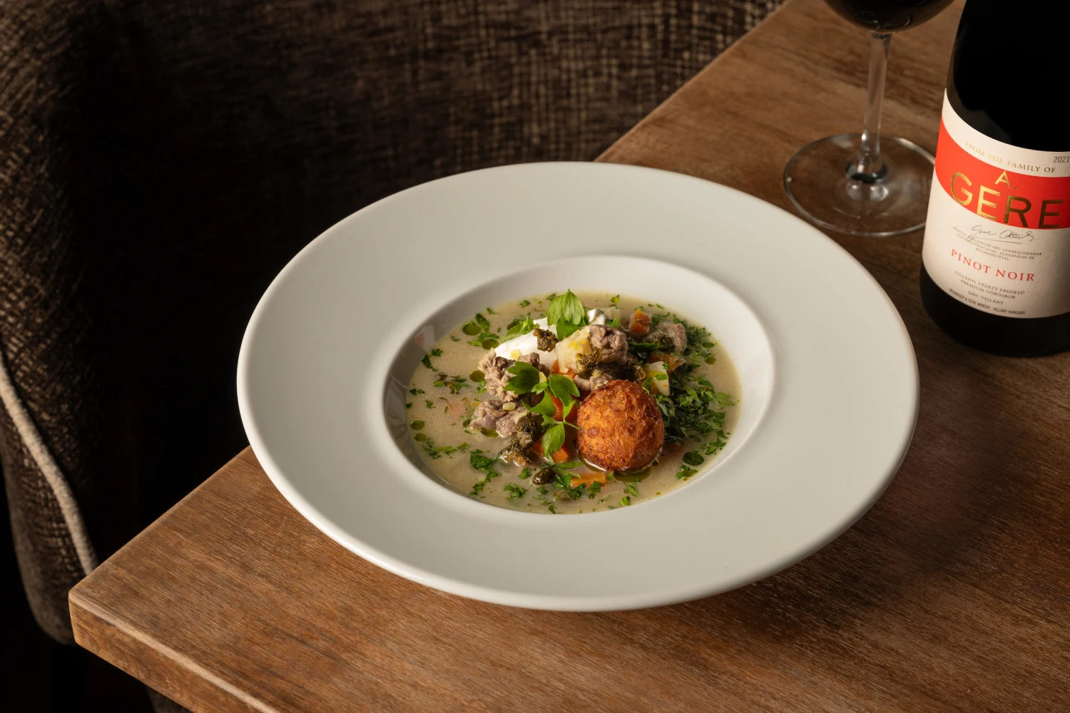 A következő tétel – egy 2021-es pinot noir a Konkoly-dűlőből – a bárányragulevest kísérte, ez is olyasmi, amit másnap ebédre búcsúzóul még egyszer meg kellett kóstolnunk. A bárány a család közeli majorságában nevelkedett, a tejfölt Borjádról hozták (selymes volt, a szokásosnál kevésbé fanyar), és ez önmagában már sokat sejtet a séf filozófiájáról.