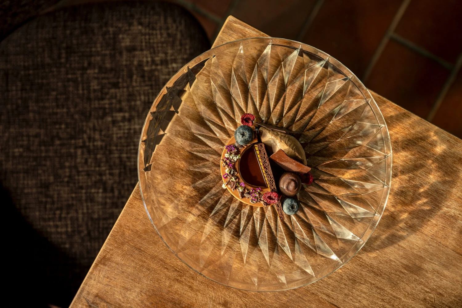 Ezen a ponton egyébként már a nagyborokhoz érkeztünk. A kacsához az Ördögárok-dűlőben szüretelt 2022-es villányi franc volt a párosítás, a desszerteket – elvileg háromfélét, kérésünkre már csak kettőt, és azt is felezve – Solus kísérte a Kopár-dűlőből. Utóbbi kiemelkedő társa volt a csokis desszertet kiegészítő, „húsz éve elfelejtett balzsamecetnek”, ami létező tétel az étlapon valós történettel.