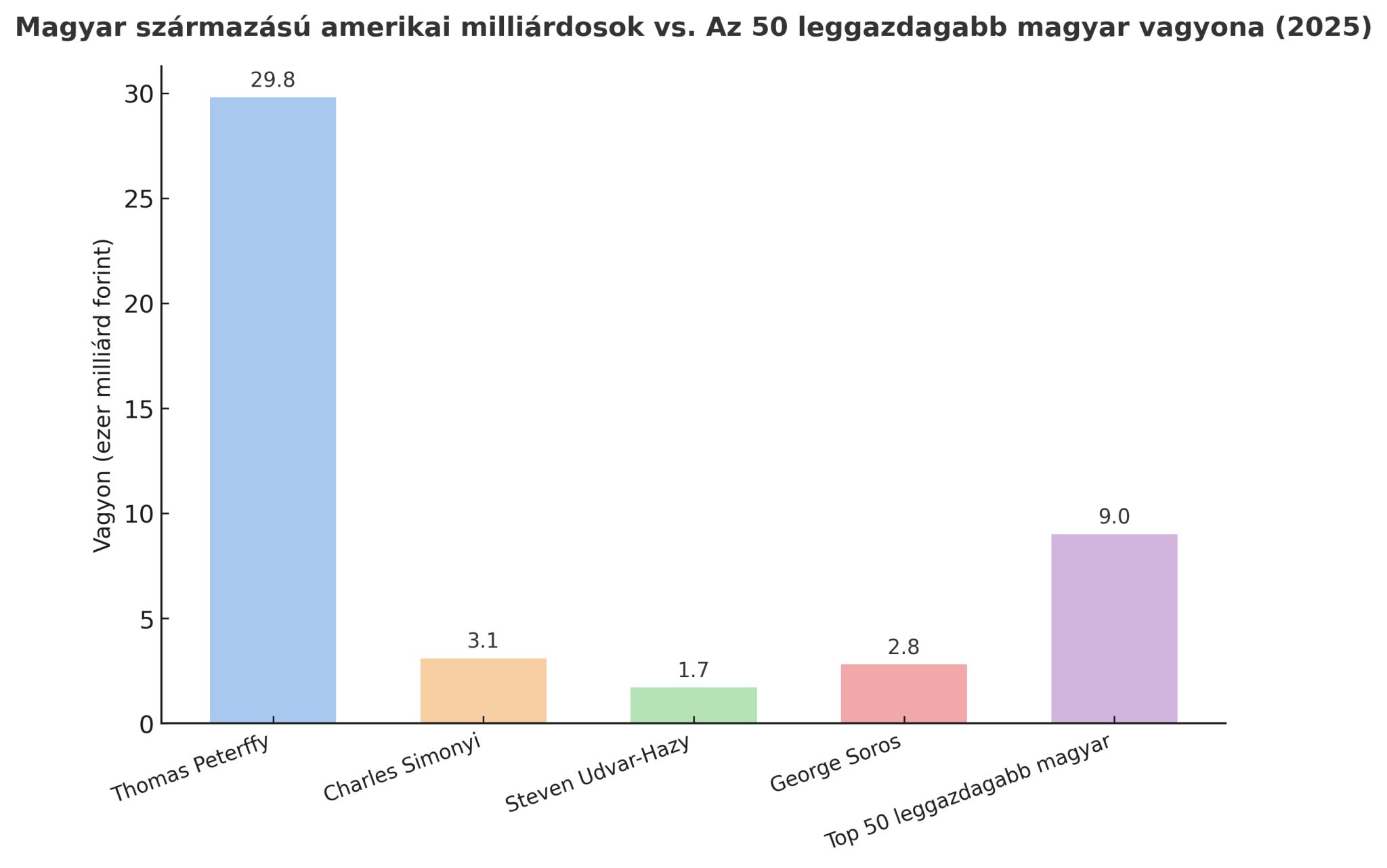 A négy magyar bevándorló vagyona összesítve mai árfolyamon 37 400 milliárd forintnak felel meg, ez a 2024-es magyar GDP 46 százaléka.