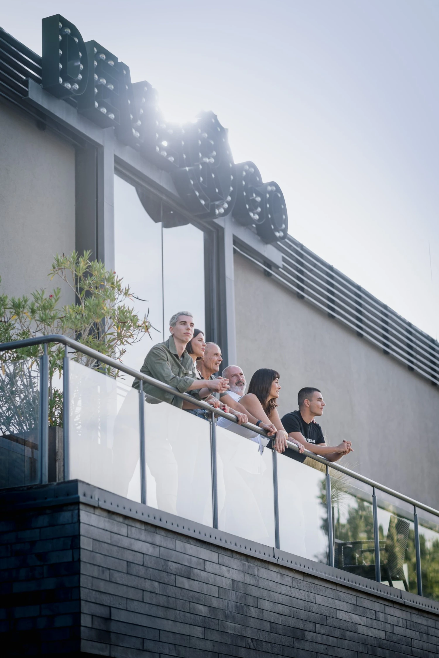 Az óbudai cégközpont teraszán. Balról jobbra: Thomas legnagyobb fia, Thanasis, aki már a tervezőcsapatban dolgozik, Ionna, aki jogot tanult, Thomas Psarogiannis, Görög Zita, Csordás Norbert kereskedelmi igazgató és a legkisebb Psarogiannis fiú, a közgazdaságtant tanuló Michalis. Fotó: Ránki Dániel/Forbes