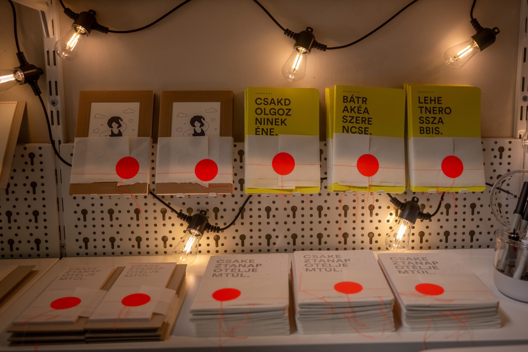 rájövök, hogy különböző színű noteszek, jegyzetfüzetek sorakoznak az üvegen túl, vicces felirattal a fedőlapon. Füzetkészítő, Notess & Co. – így a cégnév.